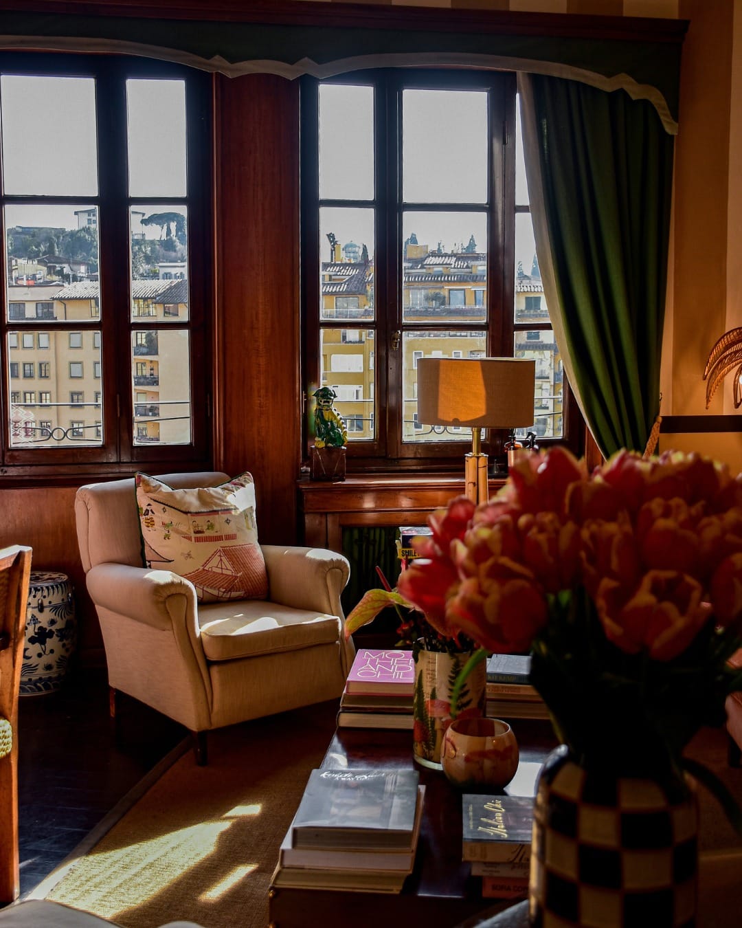 Palme ovunque. Bambù, rattan, ceramiche orientali. Poltrone vintage, libri d’arte e fotografia. E poi animali, leopardi, scimmiette, elefanti e giraffe. Un’esotica ironia che potrebbe sorprendere, affacciata su Ponte Vecchio. E invece ha perfettamente senso. Firenze, dopotutto, è sempre stata città di collezionisti curiosi, dai Medici in poi, affascinati dall’Oriente e dai Nuovi Mondi. Questo mix non è un vezzo, è una citazione colta, giocosa, affascinante.